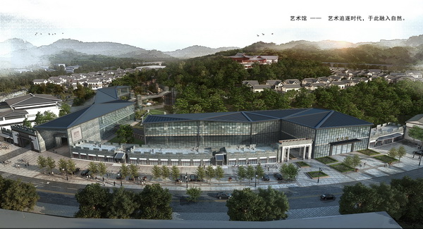 美术馆以城楼形式落座大道尽端,为团山之门。艺术馆、根雕馆蜿蜒于山涧峭壁,构筑出梦幻的艺术天地。