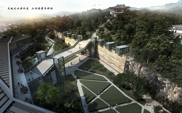 沂南,厚载历史却少负沧桑,尤其是书画。团山位于卧龙山龙头位置。本项目采用一山一城一廓一太极的格局。环山布街,朝山设路,设计通过对中国传统文化的解读和运用,结合团山复杂高差创造变幻,形成“一城四门一峰书院,前朝后市山麓宅墅”规划结构。