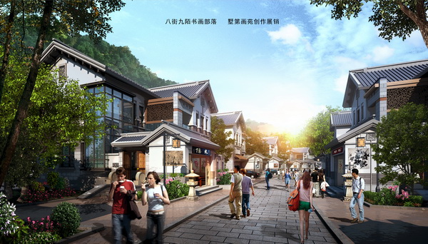 书画部落由坊、街、墅、院组成,列阵24坊,家家园林户户幽深。商业是古城的重要构成,山寨外郭规划有书画工厂、作坊和书画宝斋城。