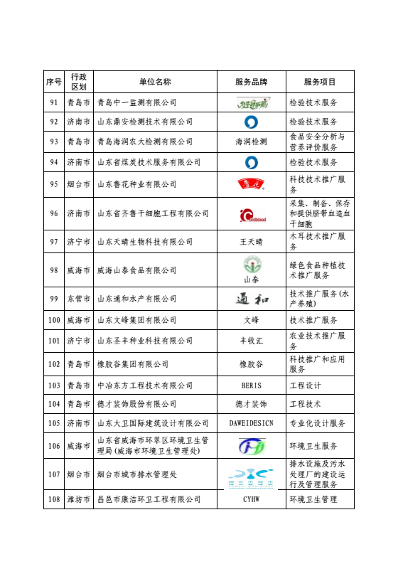 2015年度山东省服务名牌名单