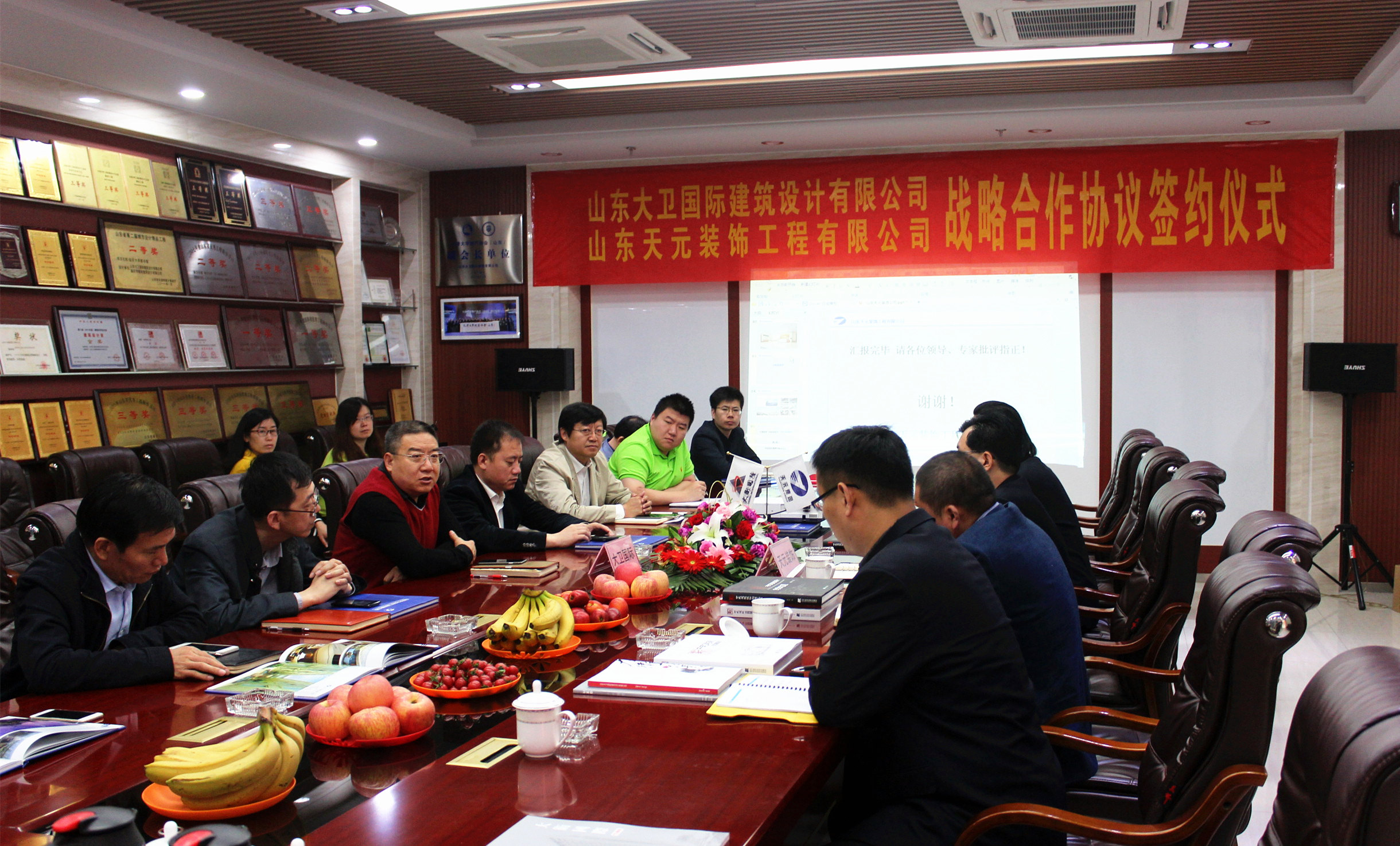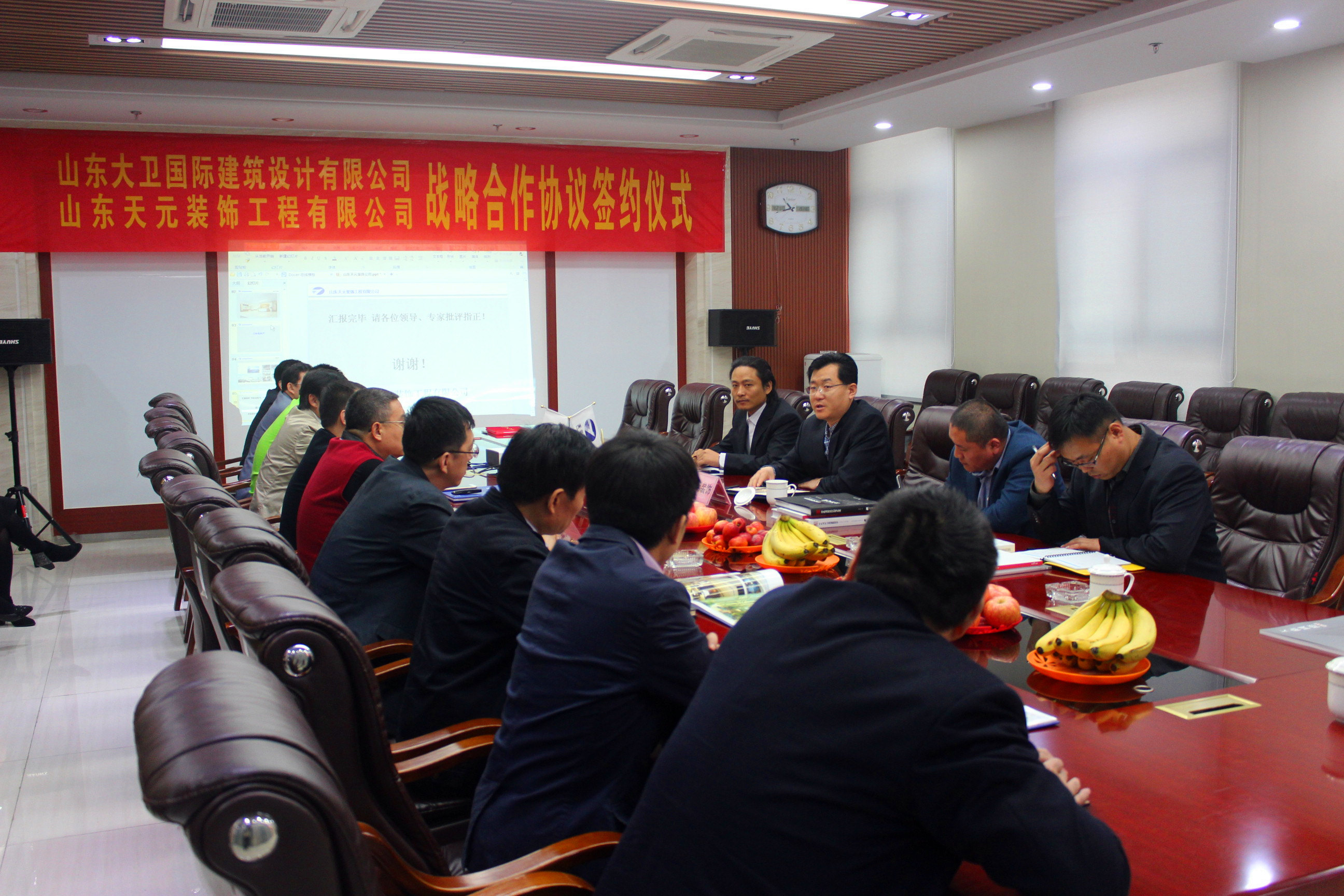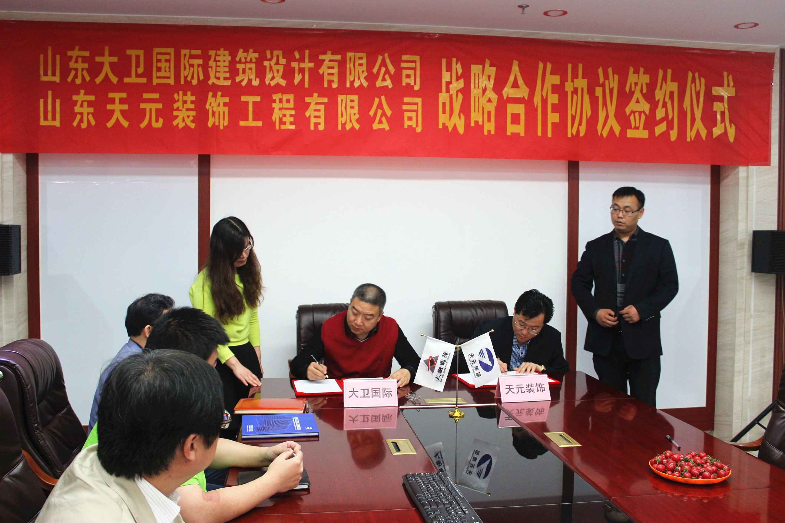 近日,山东大卫国际建筑设计有限公司与山东天元装饰工程有限公司战略合作协议签约仪式,在大卫国际第二会议室顺利举行,公司董事长申作伟、总经理张冰、副总经理王健、各分院领导及装饰公司经理赵纪峰等参加了签约仪式。
