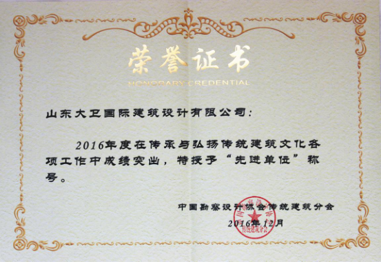 大会对中国传统建筑行业2016年度先进单位进行了表彰,山东大卫国际建筑设计有限公司荣获中国传统建筑行业2016年度先进单位,本次殊荣是对山东大卫国际建筑设计有限公司近年来在传统文化建筑传承和创新方面所做努力的肯定。