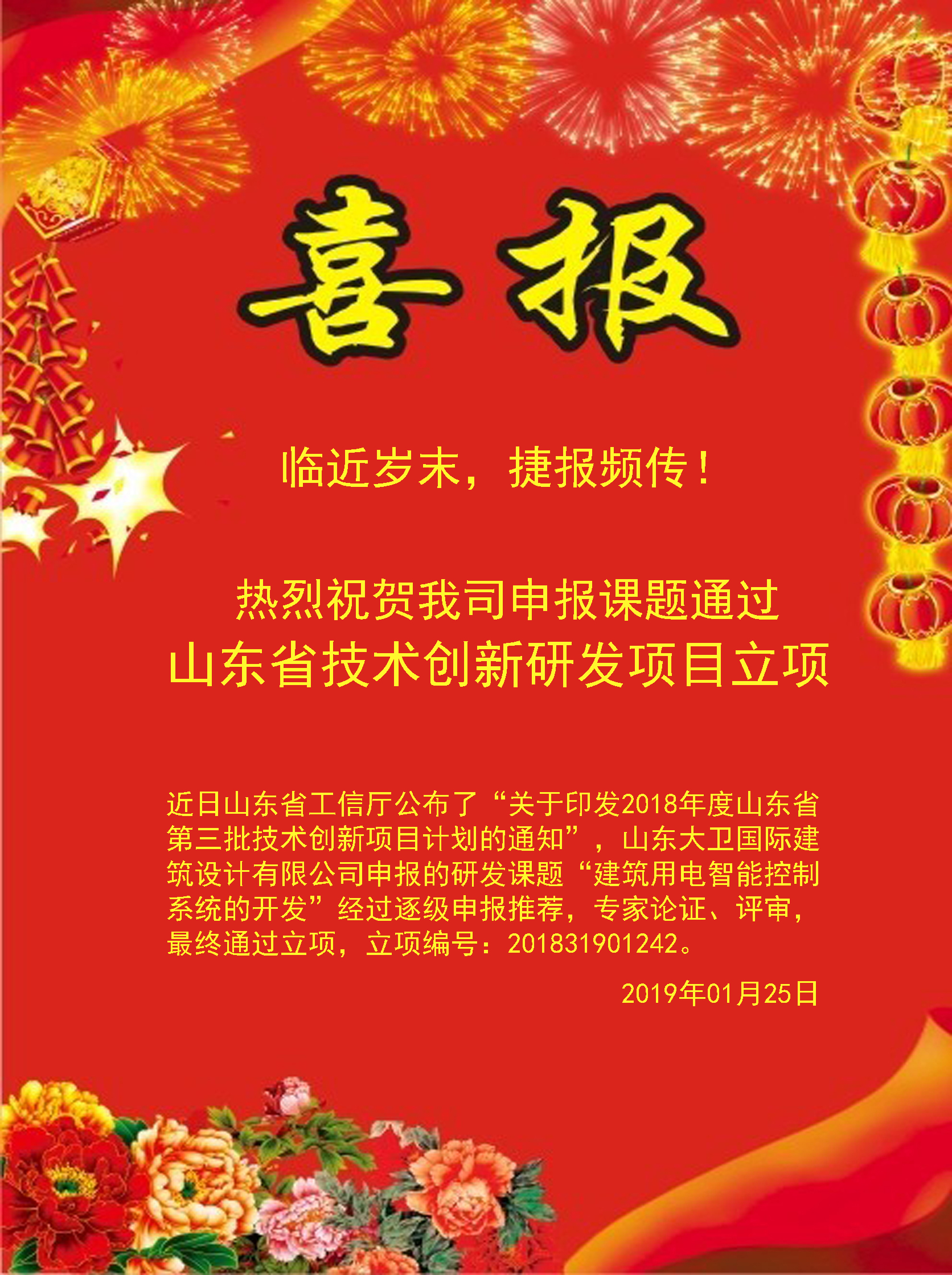 近日山东省工信厅公布了“关于印发2018年度山东省第三批技术创新项目计划的通知”,山东大卫国际建筑设计有限公司申报的研发课题“建筑用电智能控制系统的开发”经过逐级申报推荐,专家论证、评审,最终通过立项,立项编号:201831901242。该项目由我司机电设计院院长孙鸿昌担任项目负责人,由王升军、张卫芳、黄广国、贾卫、崔钦超等组成项目研发组。